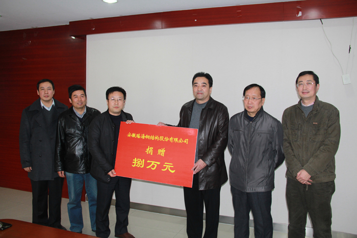 本報(bào)訊:2013年12月11日, 瑤海鋼構(gòu)集團(tuán)董事長(zhǎng)凌紅兵來(lái)到九三學(xué)社,看望及慰問(wèn)九三學(xué)社成員,并將現(xiàn)金8萬(wàn)元交到學(xué)社領(lǐng)導(dǎo)手中,希望綿薄之力能改善學(xué)社一些為社會(huì)做出貢獻(xiàn)的九三學(xué)社成員。瑤海區(qū)政協(xié)副主席葉新萌、幸?,幒9娲壬苹饡?huì)秘書長(zhǎng)郝敬勉應(yīng)邀參加此行捐款儀式。九三學(xué)社是以科學(xué)技術(shù)界高、中級(jí)知識(shí)分子為主的具有政治聯(lián)盟特點(diǎn)的政黨,是接受中國(guó)共產(chǎn)黨領(lǐng)導(dǎo)、同中國(guó)共產(chǎn)黨通力合作的親密友黨,是進(jìn)步性與廣泛性相統(tǒng)一、致力于中國(guó)特色社會(huì)主義事業(yè)的參政黨。半個(gè)多世紀(jì)以來(lái),九三學(xué)社秉承愛國(guó)、民主、科學(xué)的優(yōu)良傳統(tǒng),同中國(guó)共產(chǎn)黨在爭(zhēng)取民族獨(dú)立和人民解放的宏偉事業(yè)中風(fēng)雨同舟,在社會(huì)主義革命和建設(shè)的歷史進(jìn)程中攜手前進(jìn),在改革開放和社會(huì)主義現(xiàn)代化建設(shè)的偉大實(shí)踐中團(tuán)結(jié)奮斗,發(fā)展成為一支建設(shè)中國(guó)特色社會(huì)主義事業(yè)、維護(hù)國(guó)家安定團(tuán)結(jié)的重要力量。身為九三學(xué)社一員的瑤海鋼構(gòu)董事長(zhǎng)凌紅兵,深刻了解到九三學(xué)社的發(fā)展的不易,其中的一些成員為了九三學(xué)社的發(fā)展更是奉獻(xiàn)了畢生的精力,自己卻仍然生活在社會(huì)的最底層,這些凌董事長(zhǎng)都看在眼里,記在心里,多次盡微薄之力給予實(shí)際的幫助:2009年向九三學(xué)社捐款2萬(wàn)元,2013年公司再向九三學(xué)社捐款8萬(wàn)元。